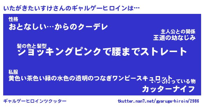 | 男性向けラノベタイトル風あだ名 | 『いたがきたいすけの憂鬱』 |