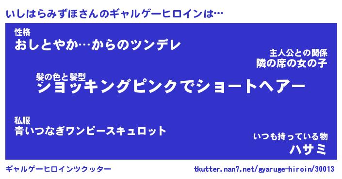 | 女子向けラノベタイトル風あだ名 | 『(仮)いしはらみずほのやんごとなき事情』 |