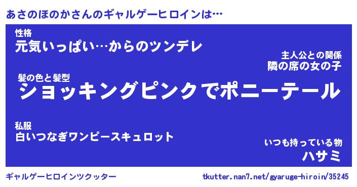 | ヒーロー風カッコイイあだ名 | 『スーパーアサノホノカ』『天弓騎士アサ』 |