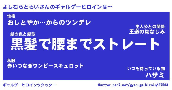 | 女子向けラノベタイトル風あだ名 | 『(仮)よしむらとらいのやんごとなき事情』 |