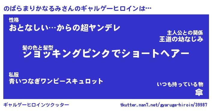 | 男性向けラノベタイトル風あだ名 | 『のばらまりかなるみの憂鬱』 |