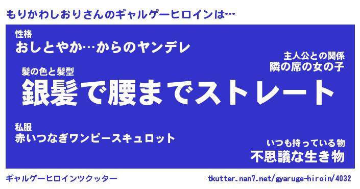 | 男性向けラノベタイトル風あだ名 | 『もりかわしおりの憂鬱』 |