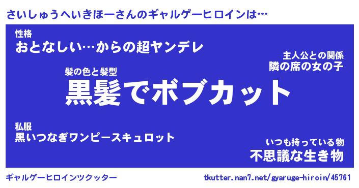 | 男性向けラノベタイトル風あだ名 | 『さいしゅうへいきほーの憂鬱』 |