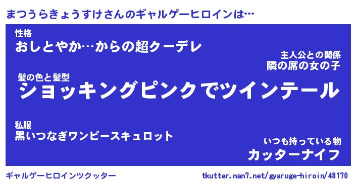 | 女子向けラノベタイトル風あだ名 | 『(仮)まつうらきょうすけのやんごとなき事情』 |