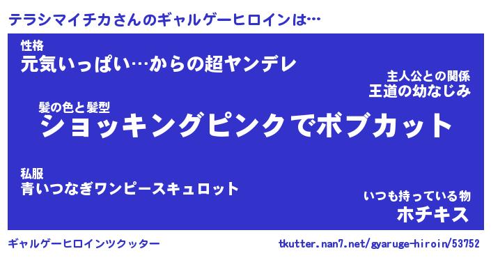 | 女子向けラノベタイトル風あだ名 | 『(仮)テラシマイチカのやんごとなき事情』 |