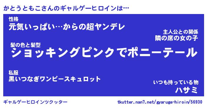 | ヒーロー風カッコイイあだ名 | 『スーパーカトウトモコ』『天弓騎士カト』 |