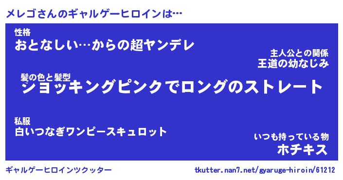 | 女子向けラノベタイトル風あだ名 | 『(仮)メレゴのやんごとなき事情』 |