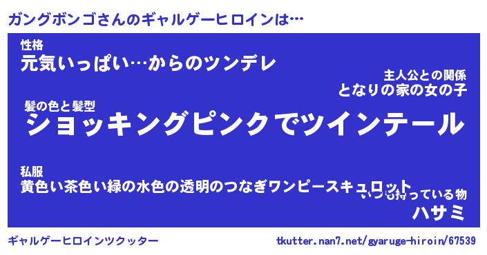 | 女子向けラノベタイトル風あだ名 | 『(仮)ガングボンゴのやんごとなき事情』 |