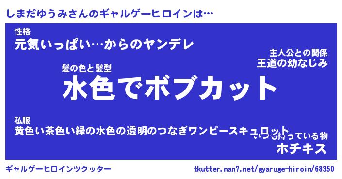 | 女子向けラノベタイトル風あだ名 | 『(仮)しまだゆうみのやんごとなき事情』 |