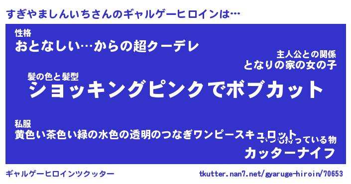 | 女子向けラノベタイトル風あだ名 | 『(仮)すぎやましんいちのやんごとなき事情』 |