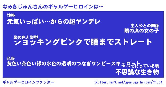 | 女子向けラノベタイトル風あだ名 | 『(仮)なみきじゅんのやんごとなき事情』 |