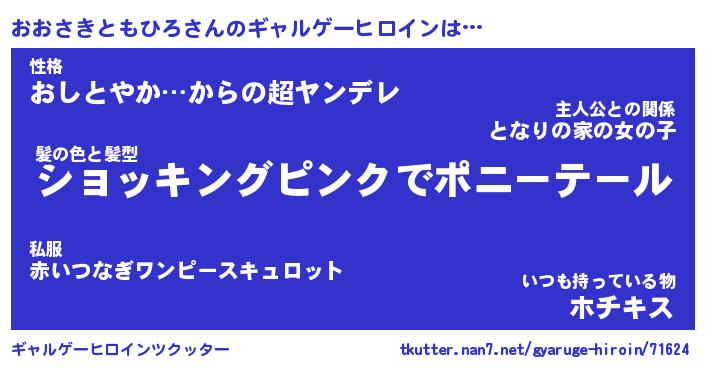 | 女子向けラノベタイトル風あだ名 | 『(仮)おおさきともひろのやんごとなき事情』 |