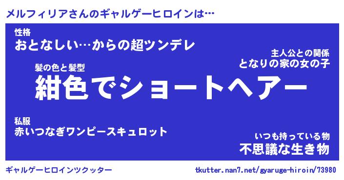 | ヒーロー風カッコイイあだ名 | 『スーパーメルフィリア』『魔戒騎士メル』 |