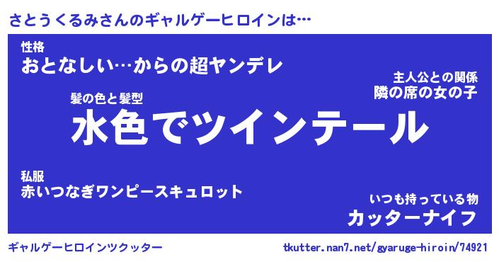 | ヒーロー風カッコイイあだ名 | 『スーパーサトウクルミ』『天弓騎士サト』 |