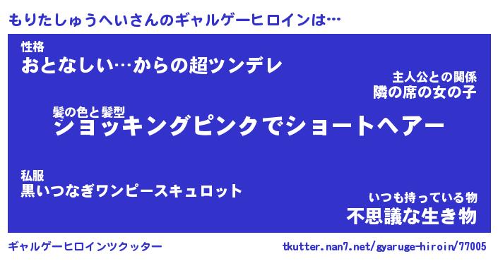 | 女子向けラノベタイトル風あだ名 | 『(仮)もりたしゅうへいのやんごとなき事情』 |
