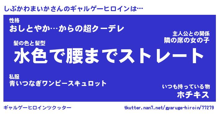 | 女子向けラノベタイトル風あだ名 | 『(仮)しぶかわまいかのやんごとなき事情』 |