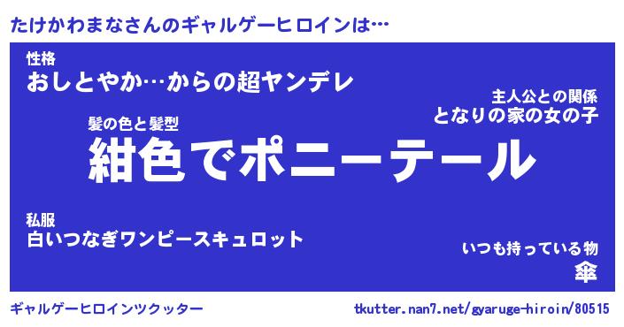| ヒーロー風カッコイイあだ名 | 『スーパータケカワマナ』『天弓騎士タケ』 |