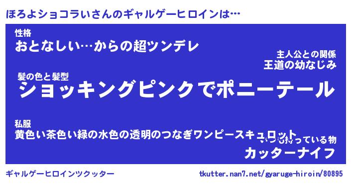 | 男性向けラノベタイトル風あだ名 | 『ほろよショコラいの憂鬱』 |