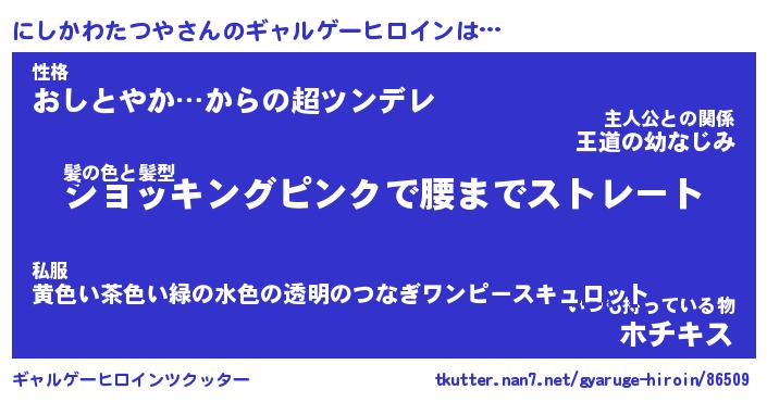 | 女子向けラノベタイトル風あだ名 | 『(仮)にしかわたつやのやんごとなき事情』 |