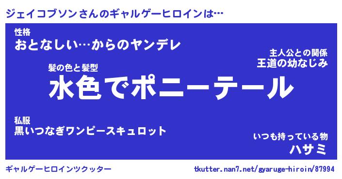 | 女子向けラノベタイトル風あだ名 | 『(仮)ジェイコブソンのやんごとなき事情』 |
