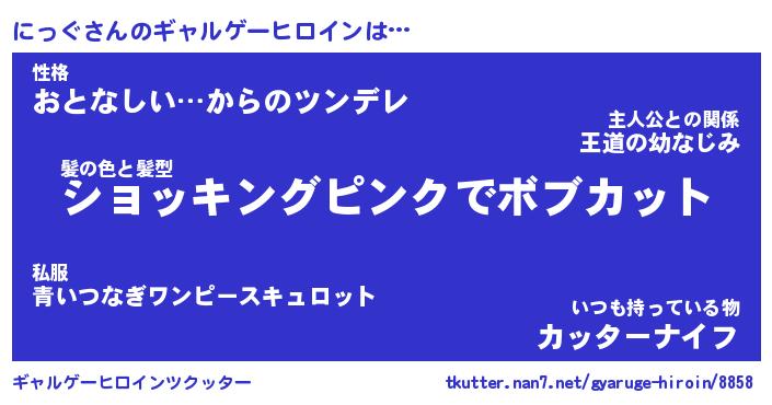 | 女子向けラノベタイトル風あだ名 | 『(仮)にっぐのやんごとなき事情』 |