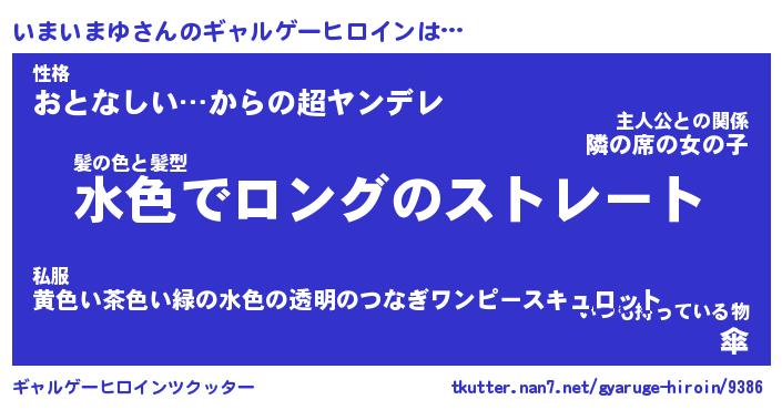 | 女子向けラノベタイトル風あだ名 | 『(仮)いまいまゆのやんごとなき事情』 |