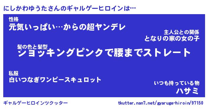 | 女子向けラノベタイトル風あだ名 | 『(仮)にしかわゆうたのやんごとなき事情』 |