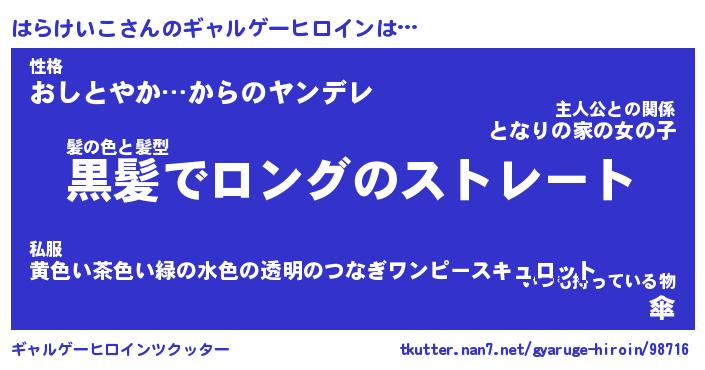 | 女子向けラノベタイトル風あだ名 | 『(仮)はらけいこのやんごとなき事情』 |
