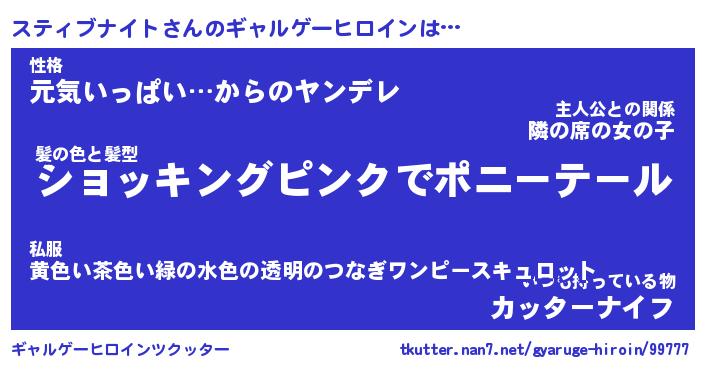 | 女子向けラノベタイトル風あだ名 | 『(仮)スティブナイトのやんごとなき事情』 |