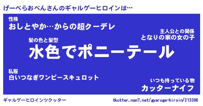 | 女子向けラノベタイトル風あだ名 | 『(仮)げーべらおべんのやんごとなき事情』 |