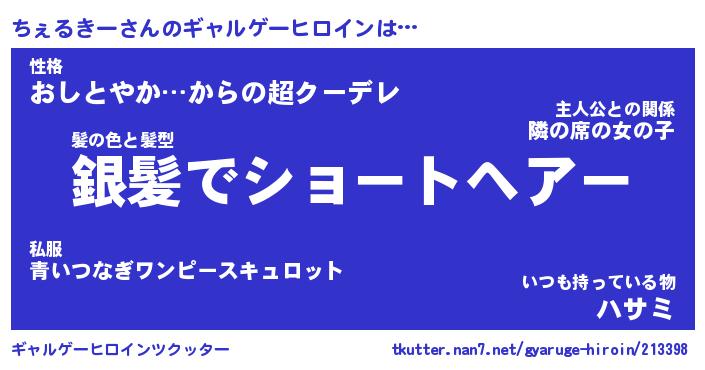 | 女子向けラノベタイトル風あだ名 | 『ちぇるきー姫と円卓の騎士』 |