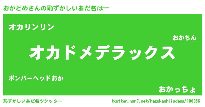 | 男性向けラノベタイトル風あだ名 | 『Re:おかどめから始める異世界生活』 |