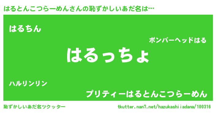 | 男性向けラノベタイトル風あだ名 | 『はるとんこつらーめん~年齢イコール彼女いない歴の魔法使い~』 |