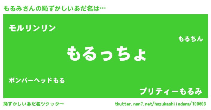 | 男性向けラノベタイトル風あだ名 | 『やはりもるみの青春ラブコメはまちがっている 』 |