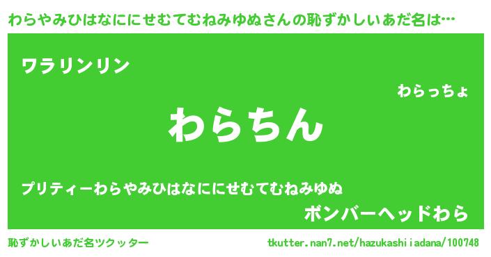 | 男性向けラノベタイトル風あだ名 | 『この素晴らしい世界にわらやみひはなににせむてむねみゆぬを!』 |