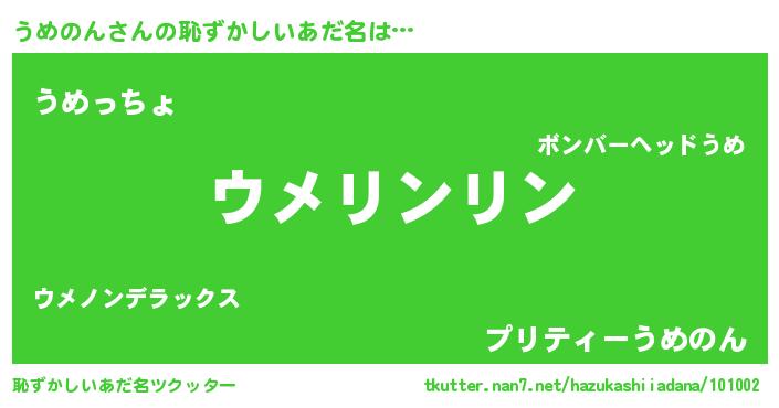 | 男性向けラノベタイトル風あだ名 | 『うめのんの嫁は女の子じゃないと思った?』 |