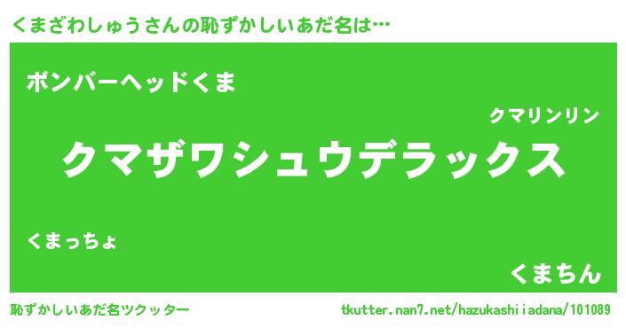 | 男性向けラノベタイトル風あだ名 | 『Re:くまざわしゅうから始める異世界生活』 |
