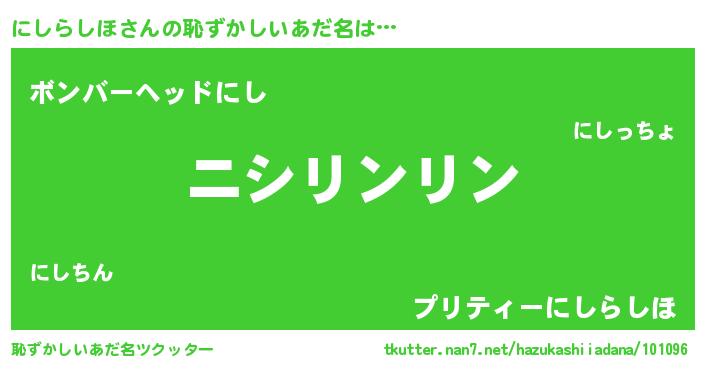 | ポケモン風あだ名 | 『ヒニシラシホ』『ニシゴンZ』 |