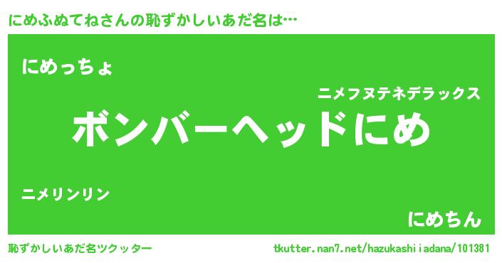 | 男性向けラノベタイトル風あだ名 | 『おまえをオタクにしてやるから、俺をにめふぬてねにしてくれ! 』 |