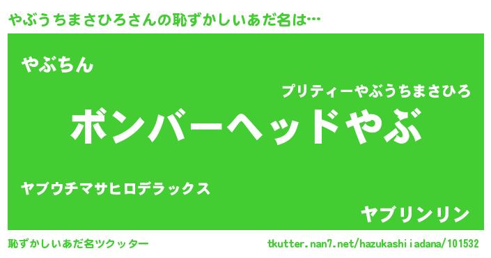 | ヘコむあだ名 | 『やぶうちまさひろ(遠い目)』『やぶぷりん』 |