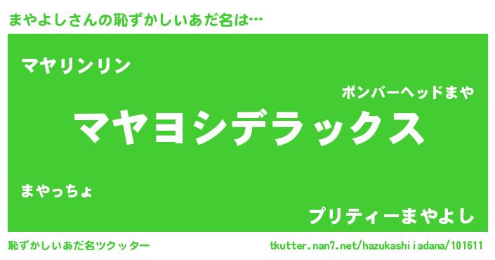| ヘコむあだ名 | 『まやお』『まやもー』『なまこ酢』 |
