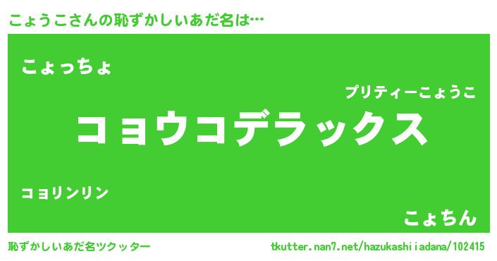 | ヒーロー風カッコイイあだ名 | 『仮面コョダー』『超時空戦士コョウコ』 |