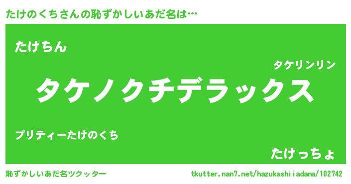 | 意味不明あだ名 | 『自称たけのくち』『永久保存たけのくち』 |