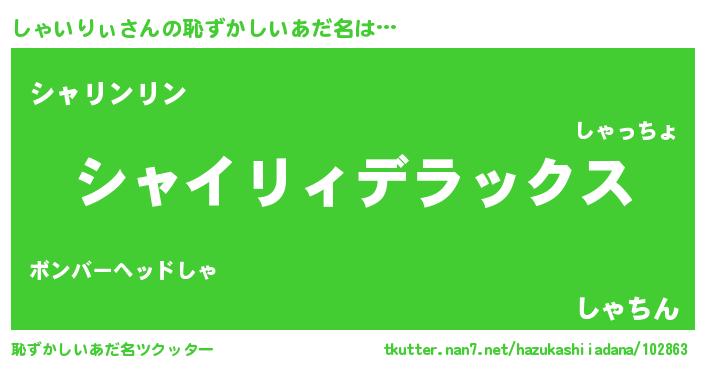 | 意味不明あだ名 | 『住所不定無職しゃいりぃ(8歳)』 |