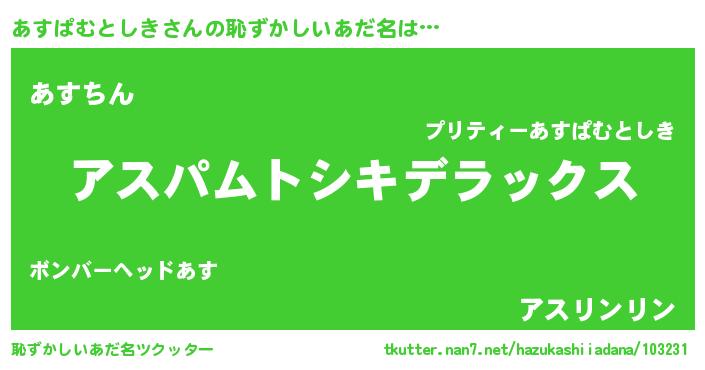 | ヘコむあだ名 | 『あすぱむとしき(笑)』『あすっぺ』 |