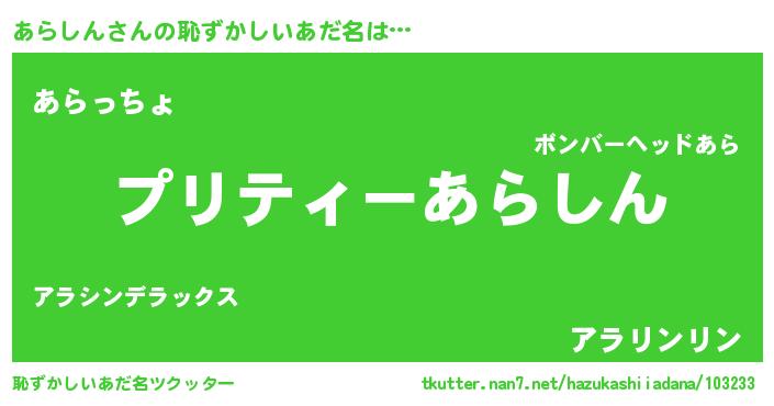 | 男性向けラノベタイトル風あだ名 | 『あらしんに滅ぼされるだけの簡単なお仕事です』 |