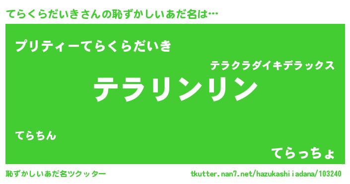 | 意味不明あだ名 | 『とにかく怪しいてらくらだいき』 |