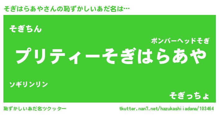 そぎはらあやさんの恥ずかしいあだ名は… 『プリティーそぎはらあや』『そぎちん』『そぎっちょ』 ツクッター #恥ずかしいあだ名ツクッター http://tkutter.nan7.net/hazukashiiadana/103464/