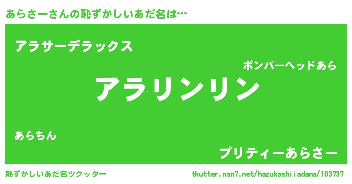 | 男性向けラノベタイトル風あだ名 | 『あらさーの嫁は女の子じゃないと思った?』 |