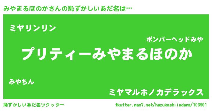 | 男性向けラノベタイトル風あだ名 | 『みやまるほのか~年齢イコール彼女いない歴の魔法使い~』 |